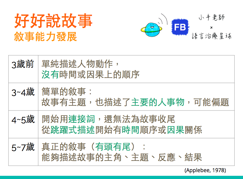 好好說故事 – 敘事能力發展 / 閱讀書寫 / 2020-07-26 描述故事或是發生過的事情時,情節常常跳來跳去?沒頭沒尾?當孩子從牙牙學語,到蹦出第一二個字一直到能夠組成一句話 接下來要學習的就是要用學會的詞彙跟句子來描述事件而敘事需要更高階複雜的語言組織與邏輯能力,所以有的孩子雖然能夠進行日常應答,但會在這個階段卡關當敘事的架構還不成熟,或是詞彙量與句法組織能力不足聽起來也就容易跳來跳去、落東落西、聽不出重點讓我們來看看敘事能力的大致發展吧! 表格是我根據Applebee兒童描述故事的研究下去改編一般來說5歲以後就能說一個情節具有順序性的故事了而7歲之後則能進一步的描述故事轉折插曲、感受…等等細節隨年齡增長發展出越來越細膩複雜的故事喔! 下次將會跟大家分享臨床治療上常使用的敘事能力練習,敬請期待