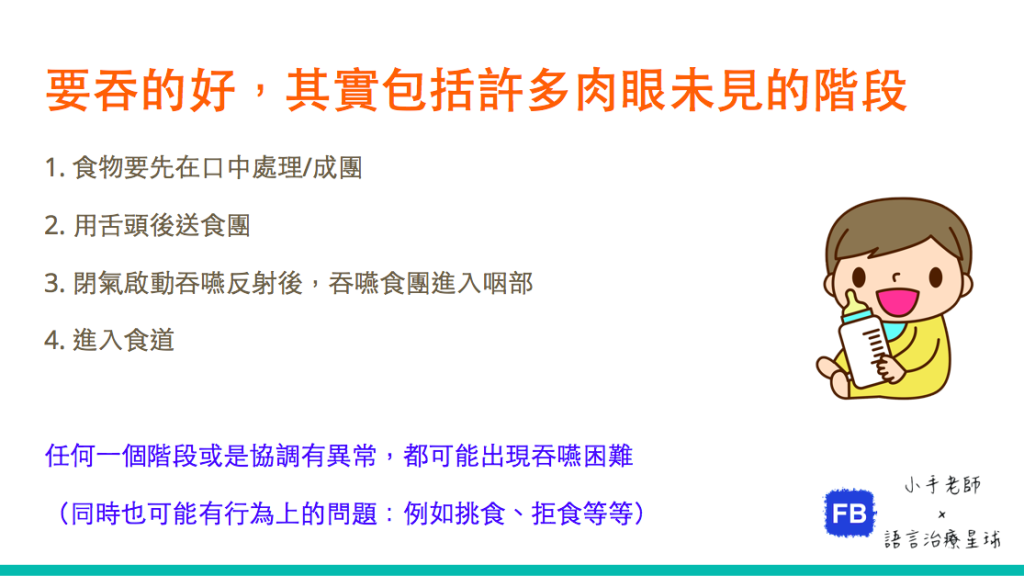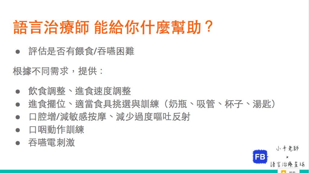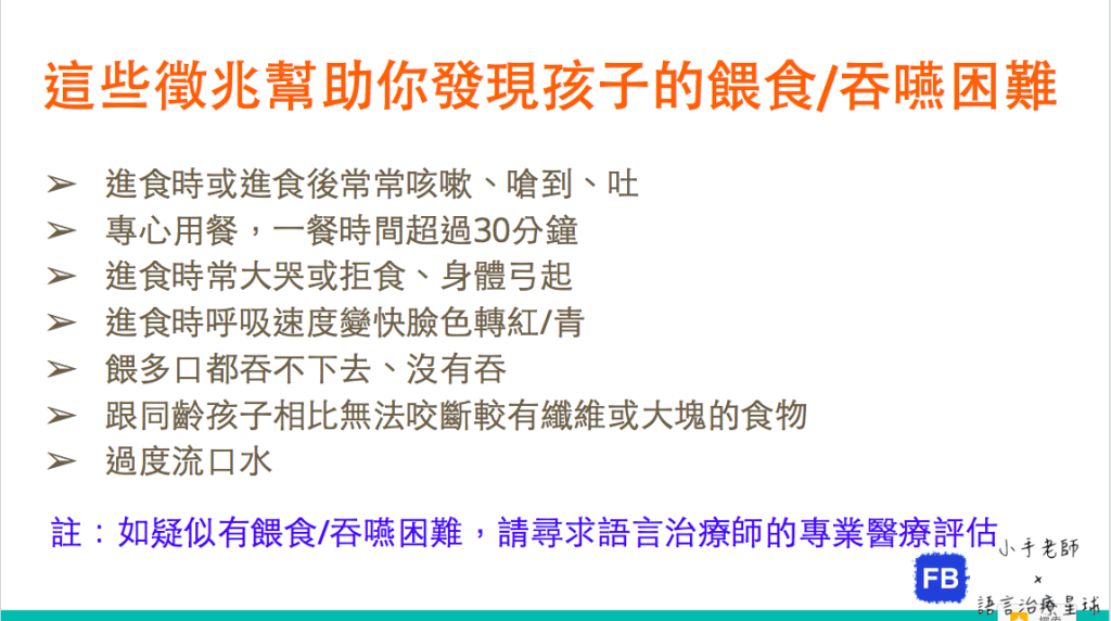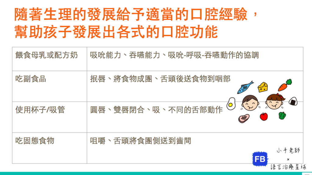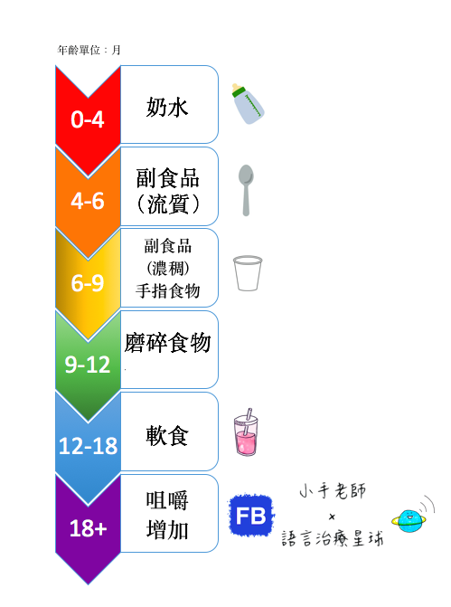 拒食、嗆到、咬不爛?語言治療師來幫忙 / 進食吞嚥 / 2020-08-03 今天來跟大家分享「嬰幼兒的餵食與吞嚥」 吃吃喝喝背後所需具備的能力很多樣 隨著生理的發展給予適當的口腔經驗是很重要的 隨著發展能力越來越成熟 能吃的食物種類越來越多 有得吃人生都變彩色的了 為大家介紹 不同時期的口腔功能發展 餵食/吞嚥困難的可能徵兆 語言治療能給予的幫助有哪些