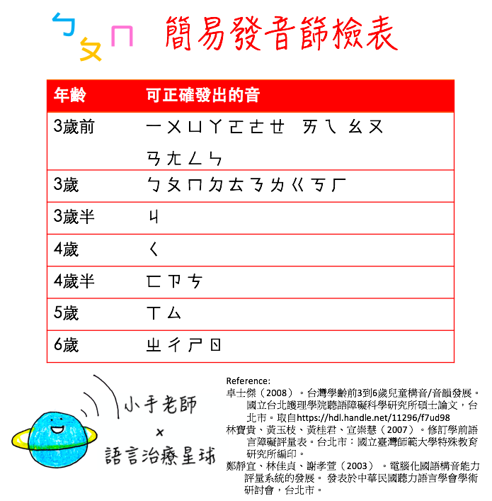 發音篩檢 (說話不標準、臭乳呆) / 構音發音 / 2020-02-10 「阿ㄉㄨㄥ,帶我出去玩!」 「ㄎㄨˋ子愛吃紅蘿蔔~」 孩子說話好像不太標準?學校老師和親戚友人有時會反應聽不懂孩子說話? 在發展的過程中,孩子會經歷一段說話臭奶呆的時期 隨著孩子生理上構音/發音系統的成長,標準的音越來越多 大約4歲後除捲舌音以外的音大多能正確發出 聽聽看家中寶貝的發音,一起照著篩檢表核對孩子目前的發展吧! 如尚未發展出該年齡層的發音,請務必進一步尋求語言治療師的評估/治療喔! 下集預告 : 怎麼矯正發音?要上正音班嗎?