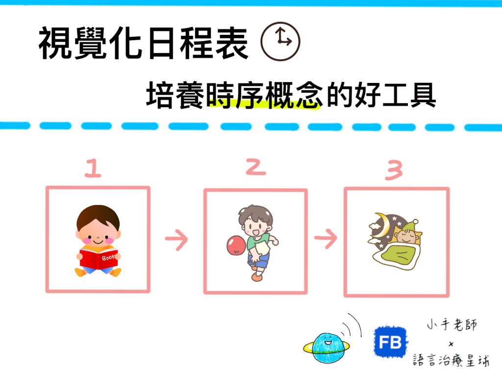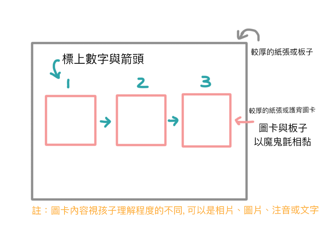 視覺化日程表(圖卡版時間表) / 相關主題 / 2020-05-31 怎麼讓孩子按部就班的完成該做的事?視覺化日程表(圖卡版時間表)是個好用的工具! 透過圖卡/數字/箭頭標示,依序排列出活動的先後順序,已完成的活動圖片即能帶孩子撕下,進行下一張圖片的活動 誰能從視覺化日程表得到幫助呢?1. 時間概念尚未建立完整2. 口語理解不佳3. 短期記憶不佳4. 自閉特質 視覺化的圖卡日程表,減少了口語理解/短期記憶的負擔,幫助孩子了解接下來該進行/還有哪些活動、什麼時候可以休息…等等 ps. 日程表內容需視孩子能力調整1. 圖片類型:相片->卡通圖->注音->文字2. 圖片數量:可以是一個活動的分解步驟、也可以是一整天的行程