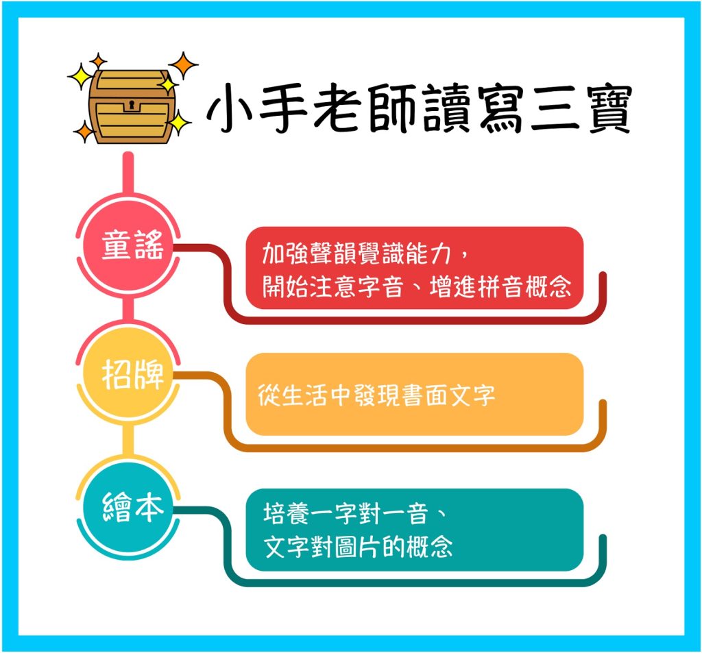 • 加強聲韻覺識能力,開始注意字音、增進拼音概念