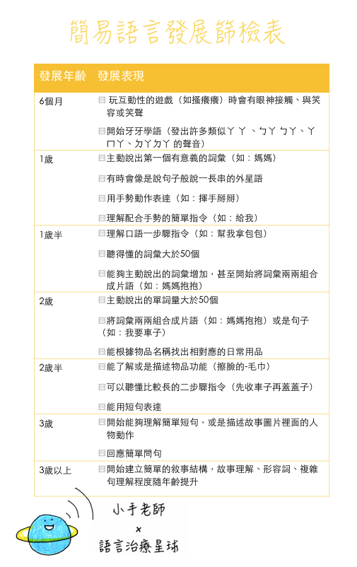 小手老師根據各式發展評估工具與臨床經驗,整理出一份自編語言簡易篩檢表給各位參考囉!